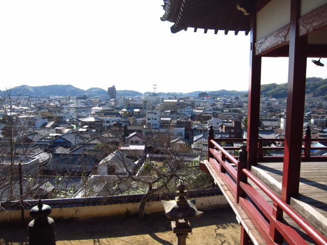 普明閣の欄干に鎮座するももねこさまと竹原市街(普明閣)(6)